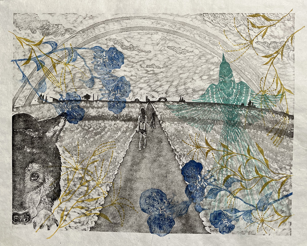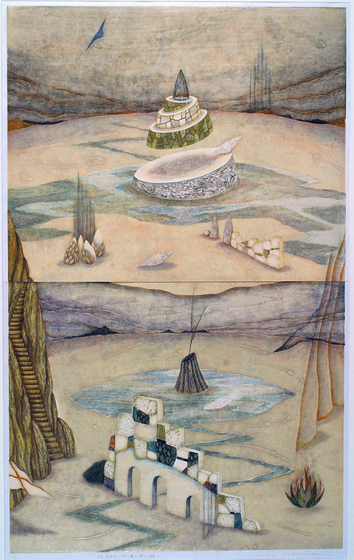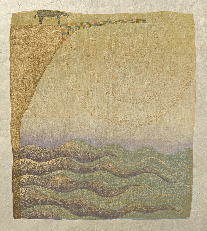 画像上から:《ヤセノダンガイ》2002年、多色水性木版/《ツルノマイヒメ》2021年、多色水性木版/《キラキラツルギ》2015年、多色水性木版